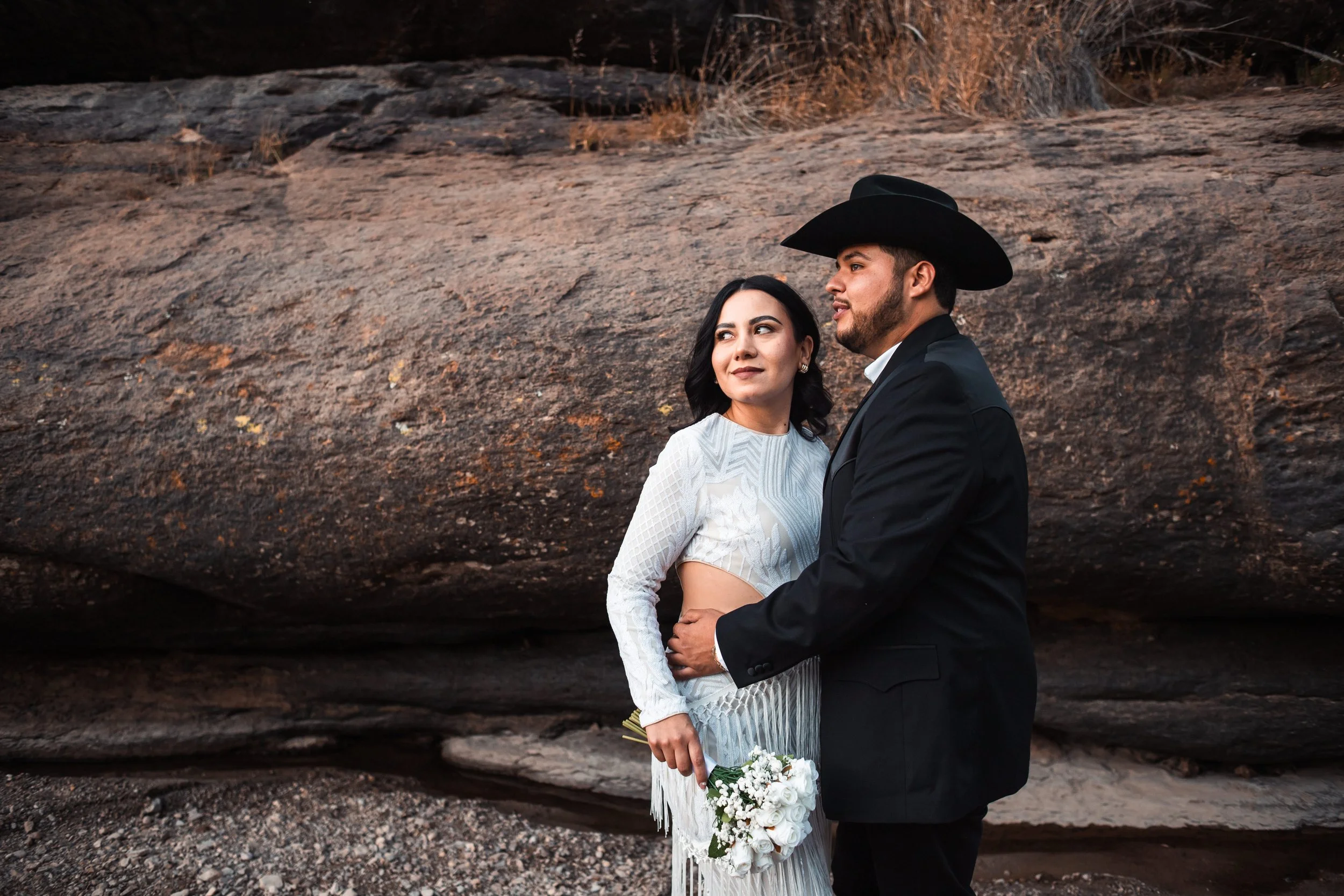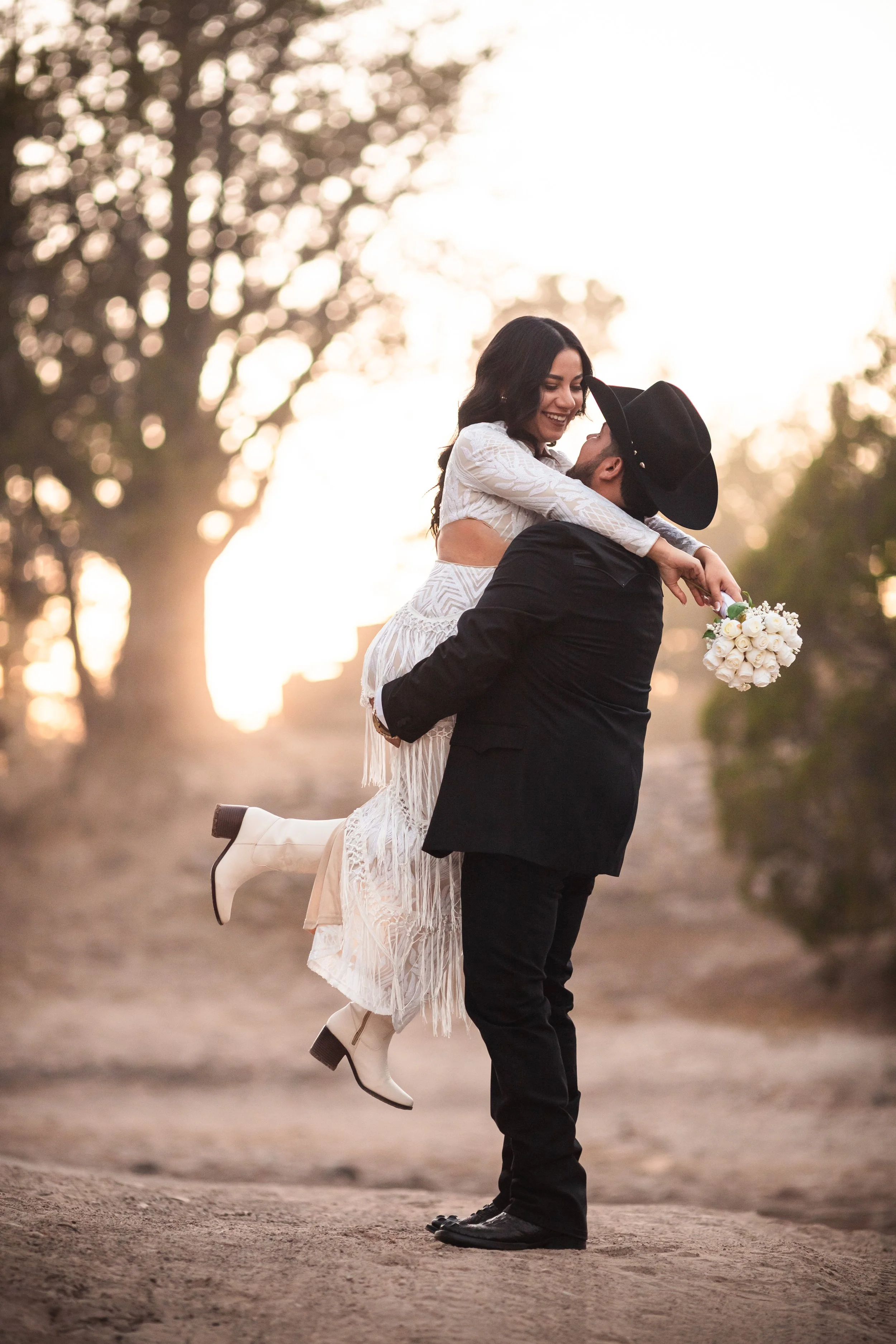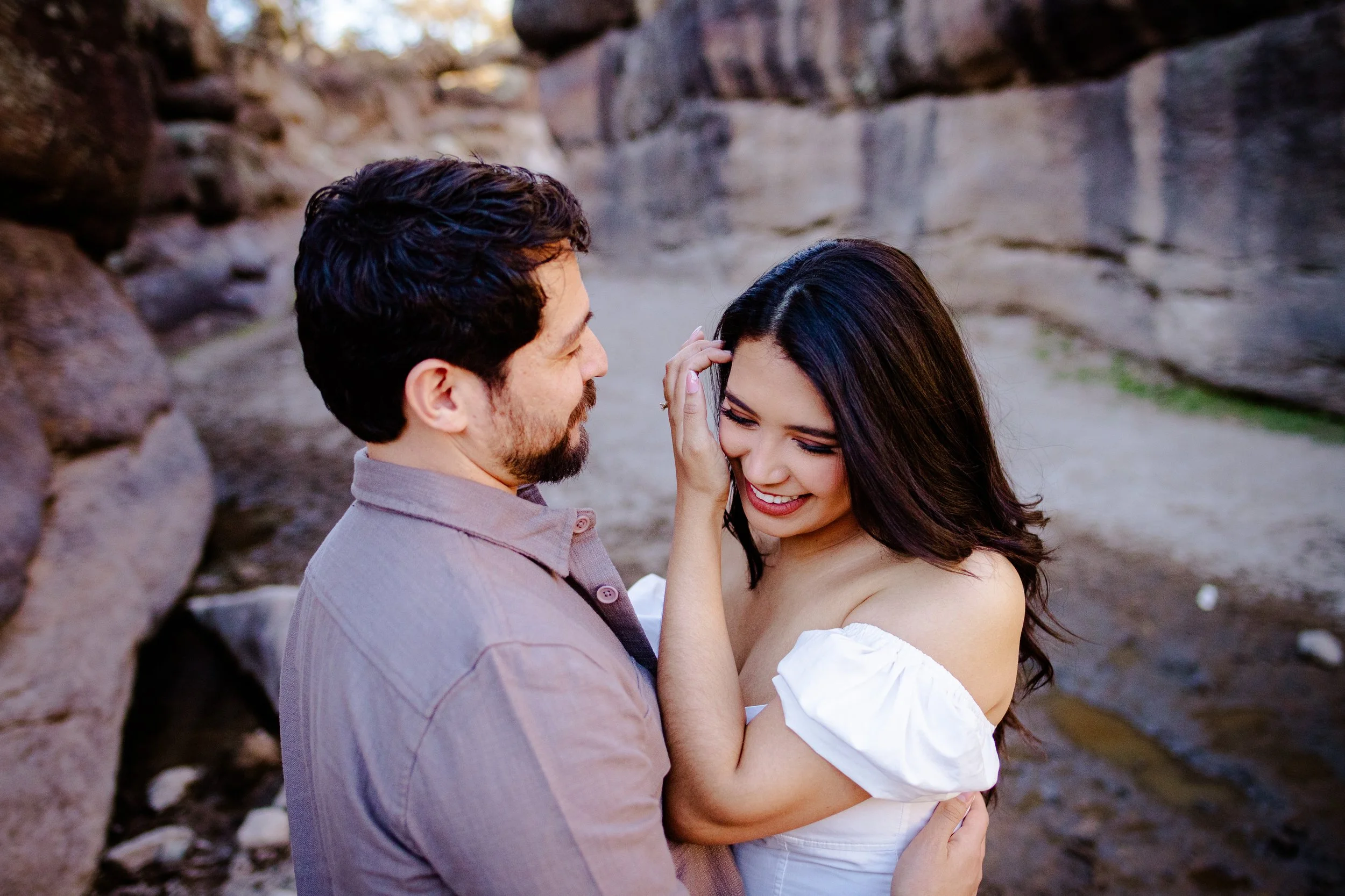 Dani & Ethan son una pareja súper fácil de fotografiar. Nos explicaron que nunca habían tenido una sesión fotográfica y que no sabían cómo posar. Les dijimos que no tuvieran temor, que era de lo más fácil porque la sesión era como estar en una cita romántica y que nosotros les diríamos cómo. No hizo falta. La sesión fue tan fácil y divertida porque la química entre ellos dos simplemente es natural y se da de inmediato. Nosotros simplemente los acomodamos en los paisajes hermosos de la sierra de Majalca, Chih., en el cauce del que fue el río “Sal-si-puedes”, y la magia llegó solita, hasta que nos anocheció.