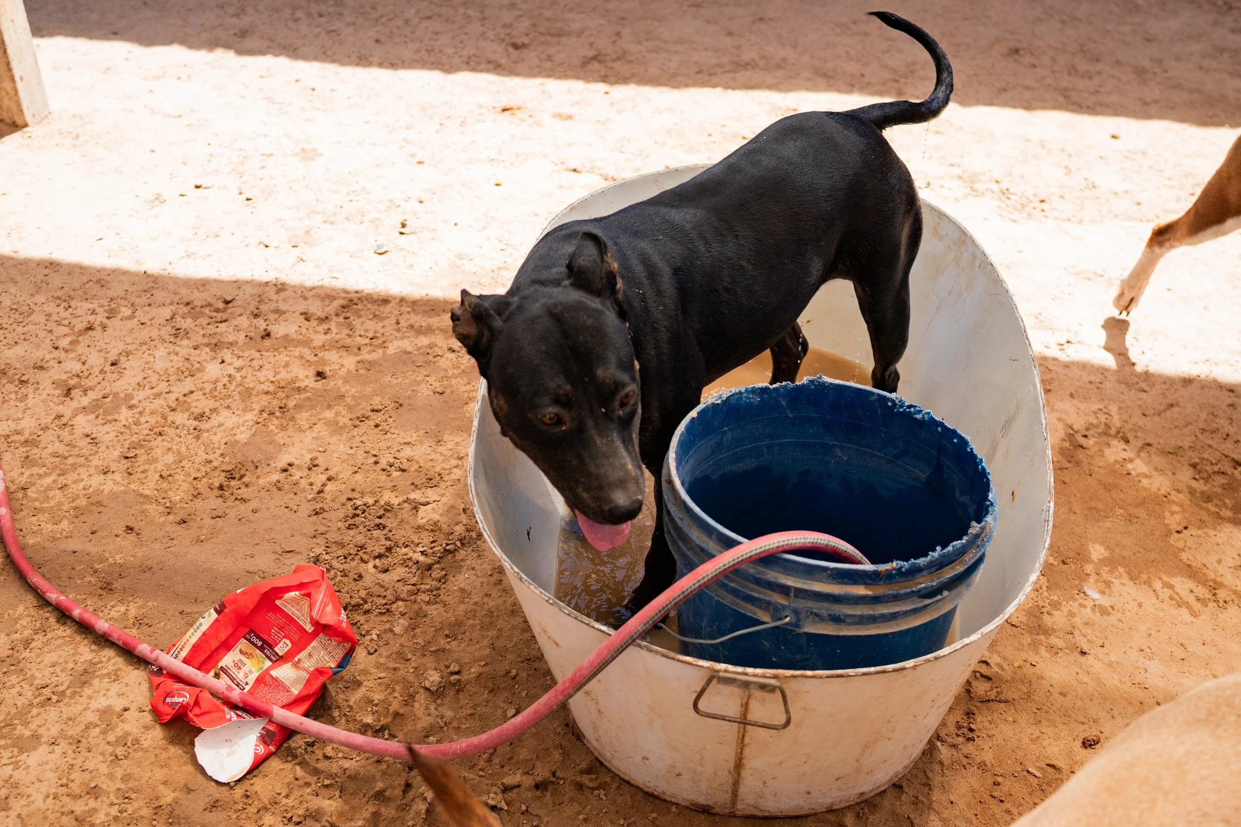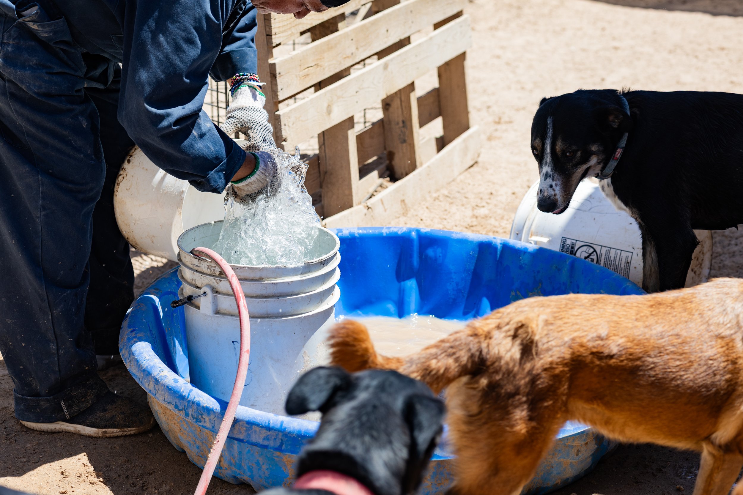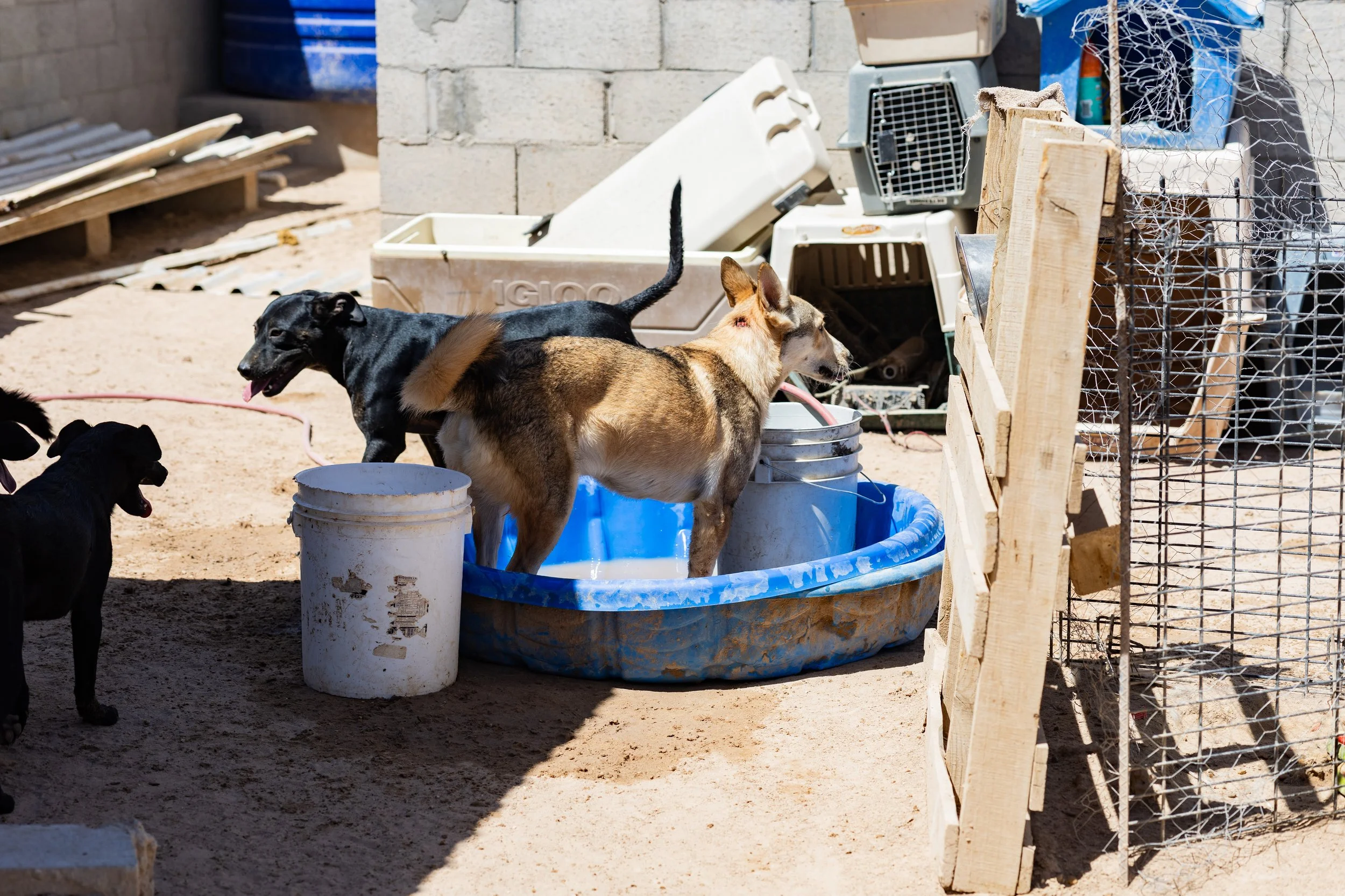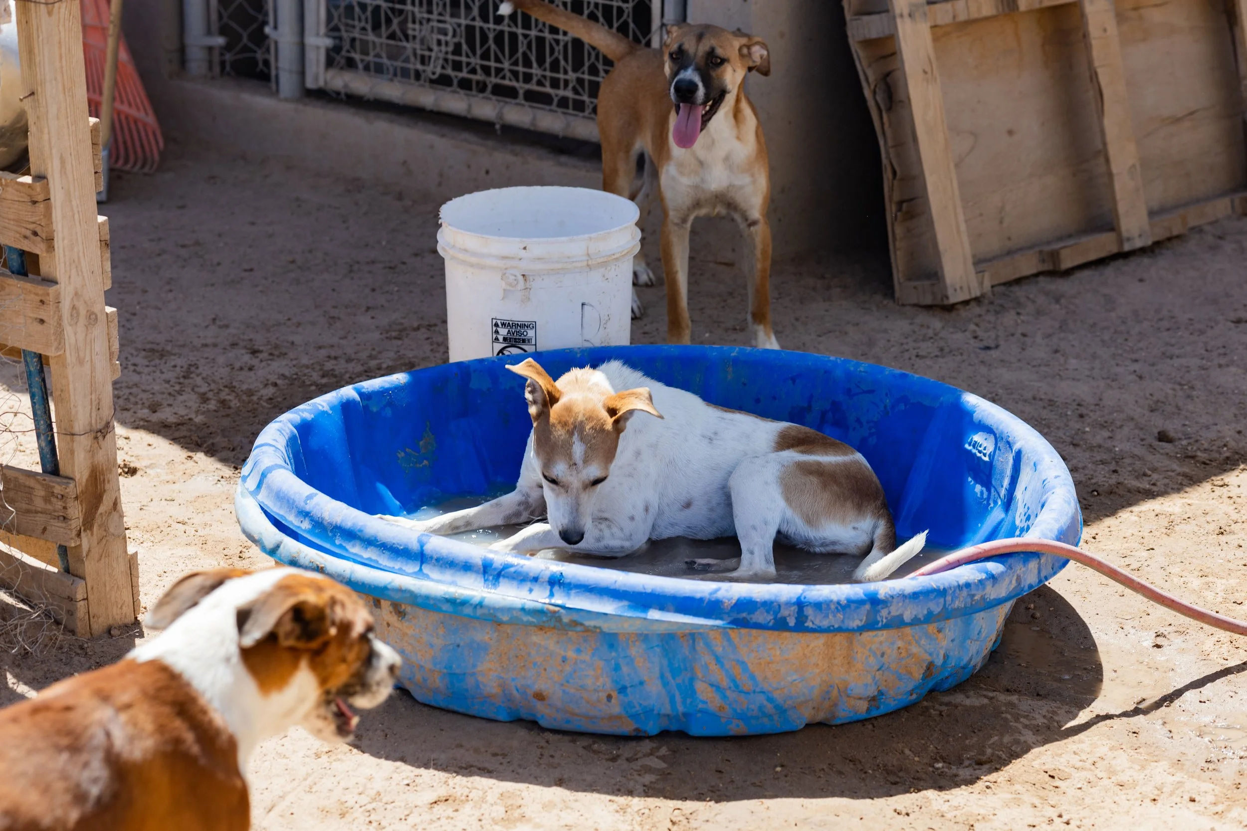 Se colocan pequeñas albercas para mantener a los perros frescos y con actividades de recreación, ya que el refugio está instalado en pleno desierto de Chihuahua y el calor es abrasador. También se ha hecho el esfuerzo de que poco a poco el refugio se mire más bonito, plantando árboles y colgando plantas para adornar el lugar y favorecer el aire fresco. Se pueden ver a los perritos ir y venir felices, disfrutando de la presencia humana y de sus hermanos.